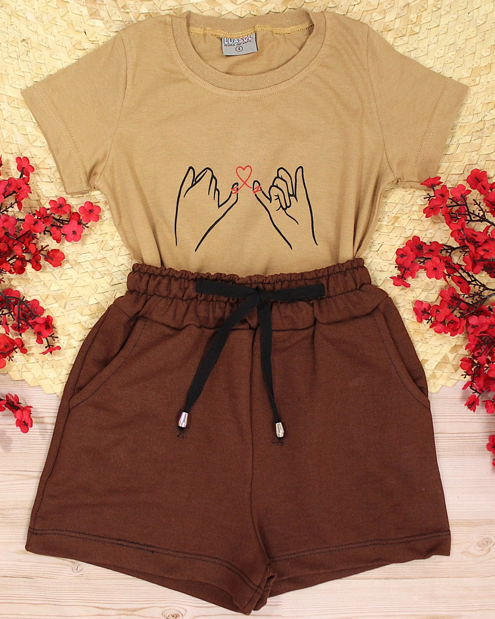 A camiseta cor cappuccino, feita em malha 100% algodão fio 30.1, traz a delicada estampa do juramento de dedinhos — um símbolo de promessas de amor entre mãe e filha. O shorts marrom em moletom careca tem bolsos funcionais, cordão ajustável e modelagem confortável para acompanhar todos os momentos do dia com leveza e estilo.