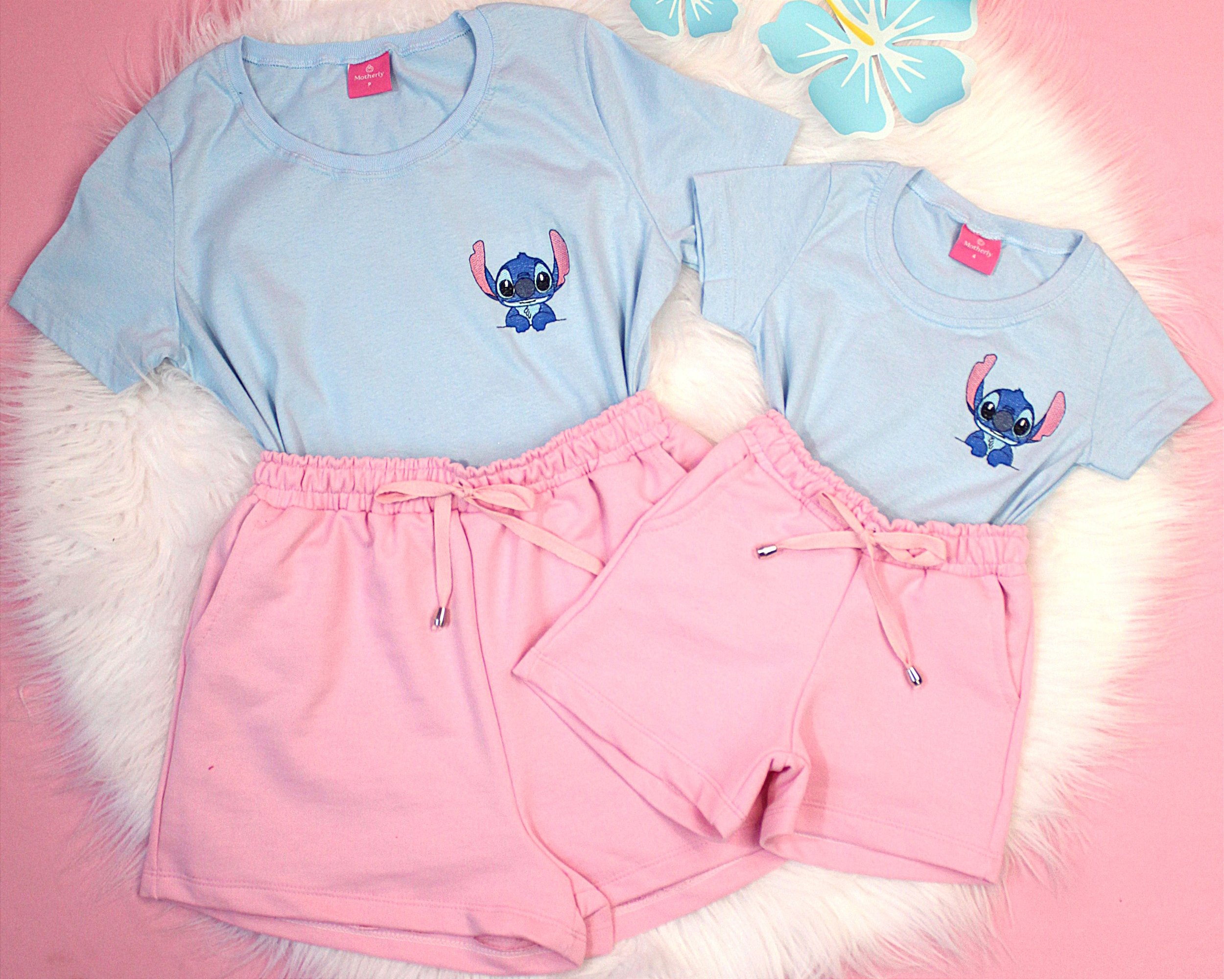 A camiseta azul clara com bordado do Stitch transmite afeto e personalidade, enquanto o shorts rosa em moletinho traz delicadeza e conforto para curtir momentos especiais juntas.