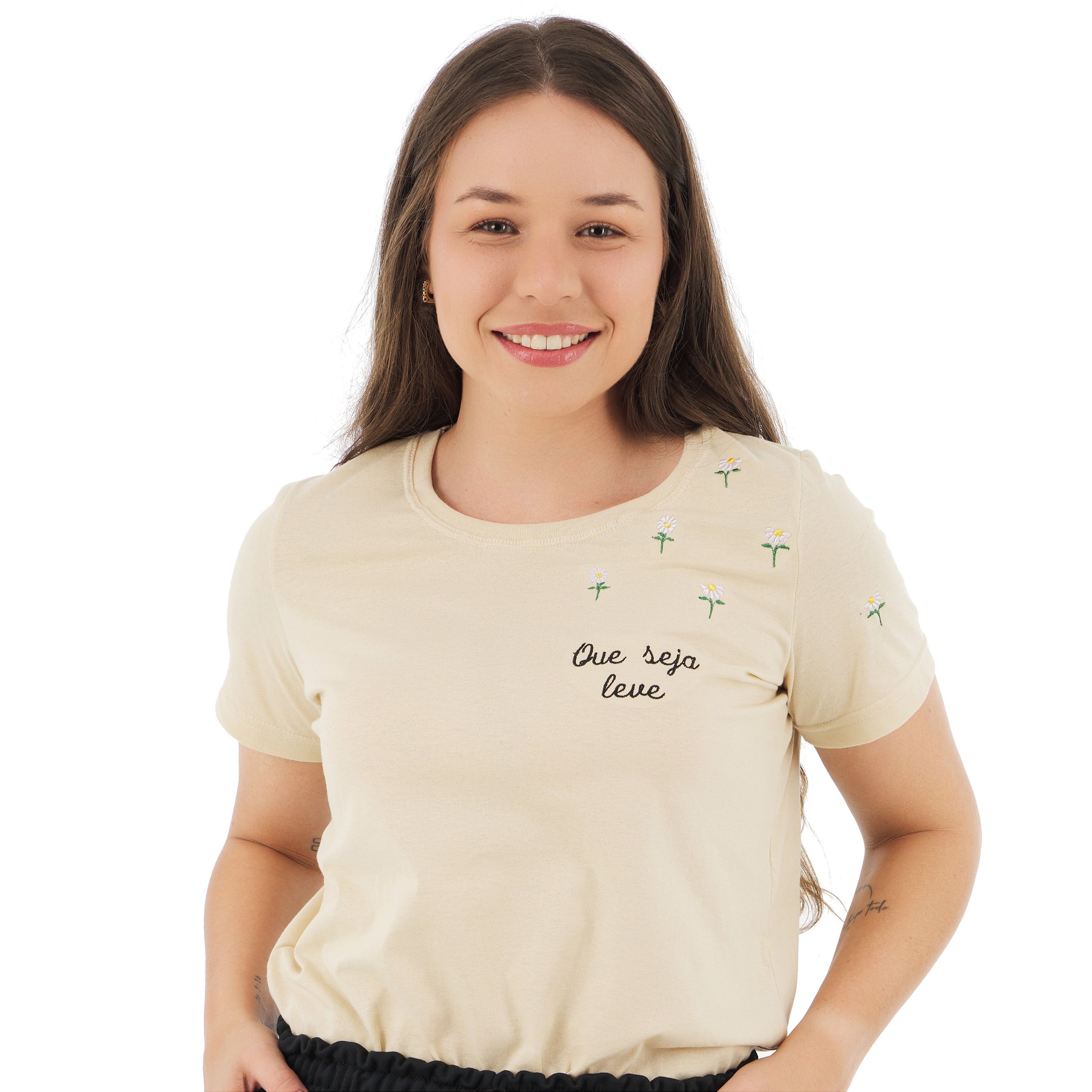 T-Shirt verão Feminina Adulta camiseta bege bordada seja leve P ao G3