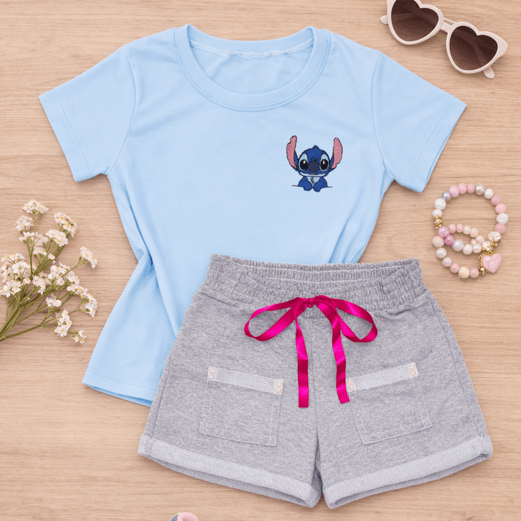 O Conjunto Infantil Stitch é ideal para passeios, escola e momentos de lazer, trazendo um visual moderno, delicado e divertido.