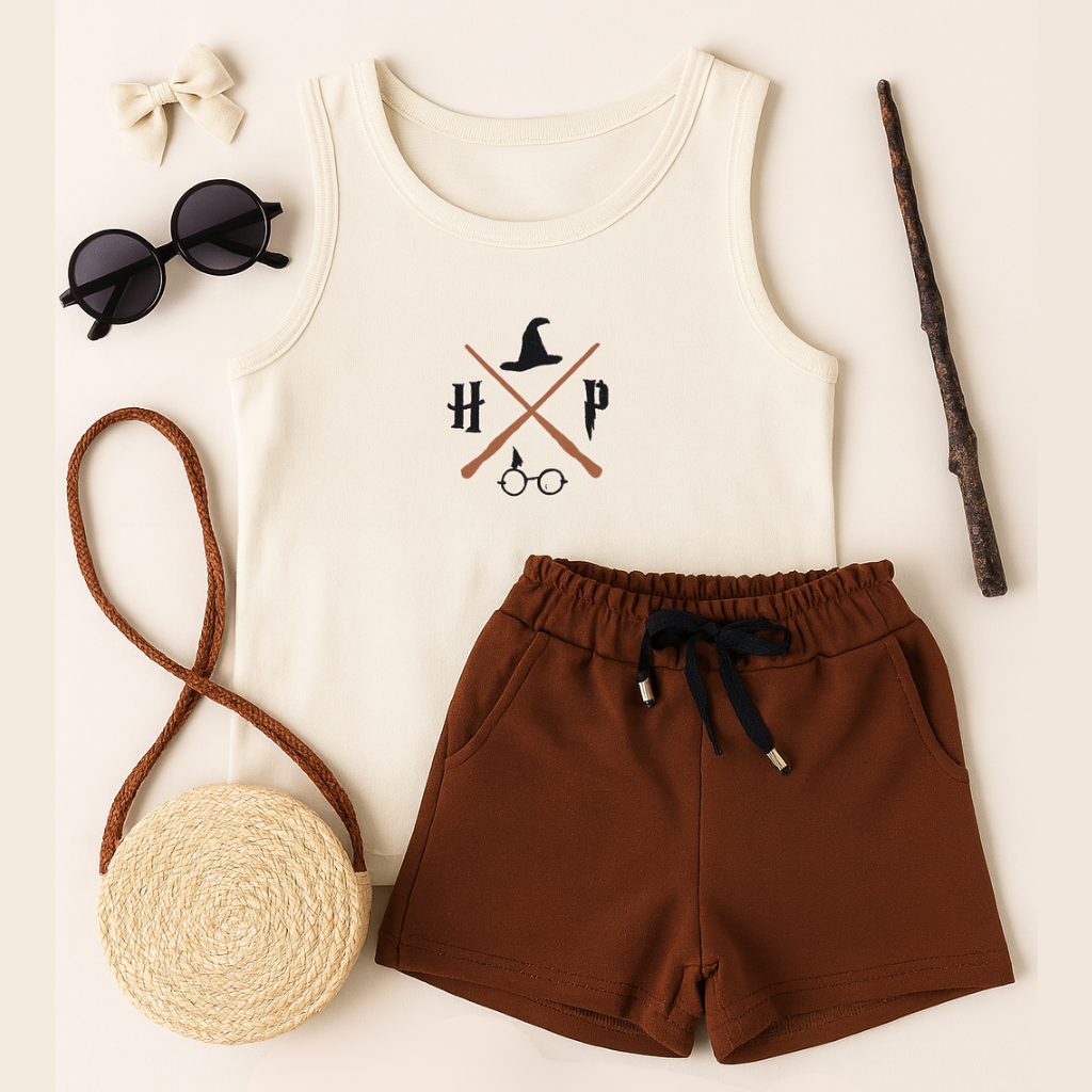 Conjunto infantil confortável e estiloso ideal para crianças fãs do universo Harry Potter A regata é confeccionada em ribana lisa proporcionando ótimo caimento elasticidade e conforto para o uso diário O shorts em moletom careca completa o conjunto garantindo liberdade de movimento e praticidade