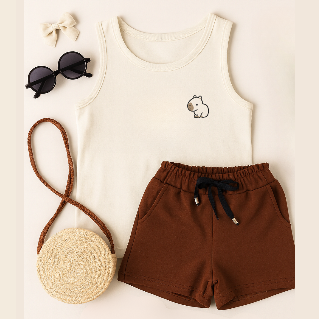 Conjunto infantil confortável e estiloso ideal para meninas que adoram capivaras... A regata é confeccionada em ribana lisa proporcionando ótimo caimento elasticidade e conforto para o uso diário O shorts em moletom careca completa o conjunto garantindo liberdade de movimento e praticidade
