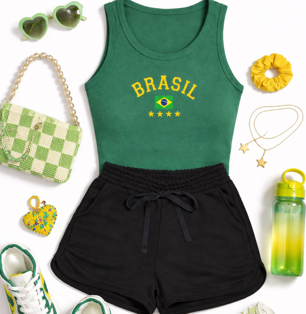 Conjunto infantil confortável e estiloso, ideal para meninas que gostam de looks modernos e práticos. Com estampa temática do Brasil, ele é perfeito para o dia a dia, passeios, escola, viagens e momentos de lazer.