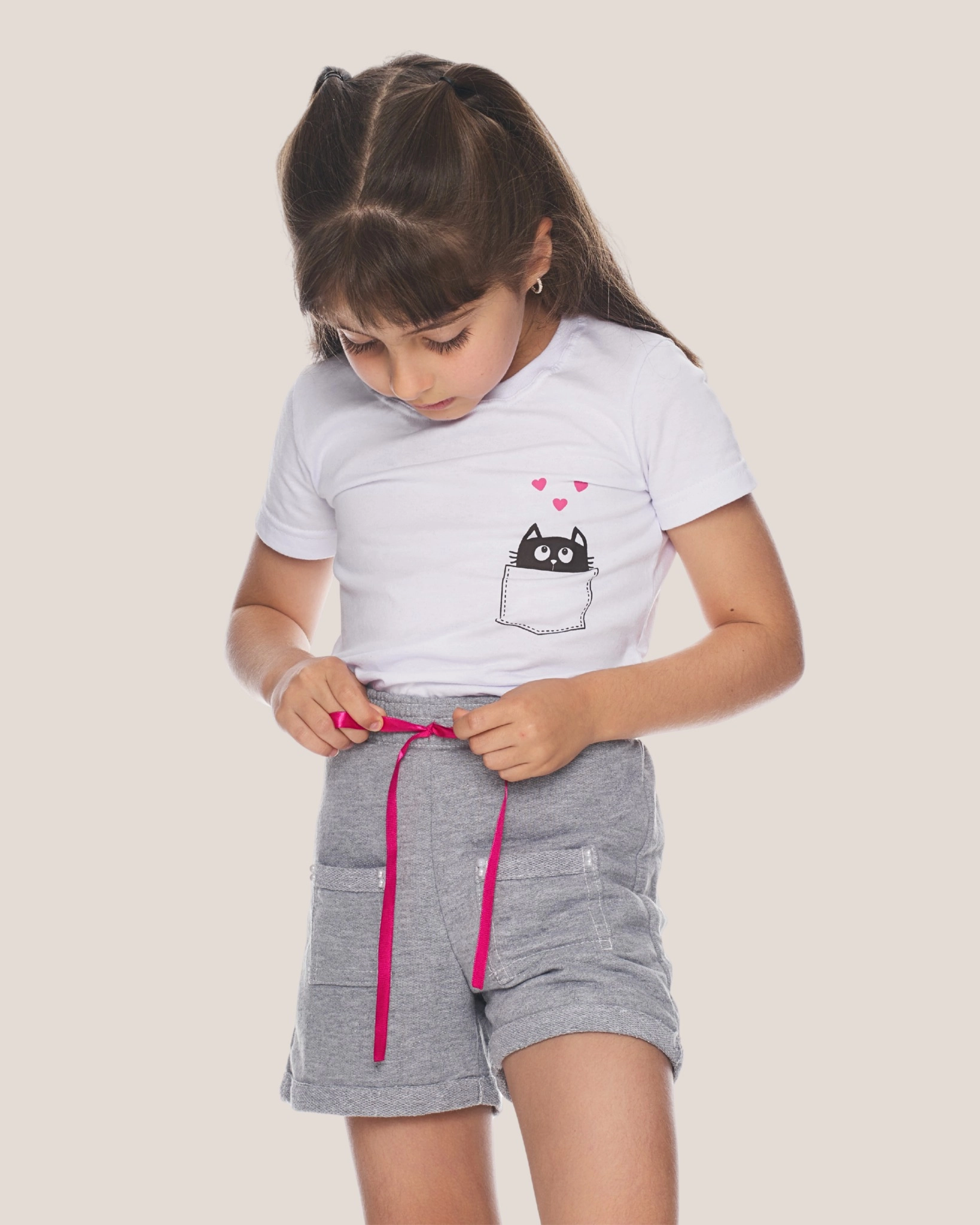 Esse conjunto foi criado para encantar! A camiseta branca traz uma estampa charmosa de um gatinho saindo do bolso com coraçõezinhos, transmitindo delicadeza e diversão. O shorts mescla em moletom careca (sem pelúcia) possui bolsos com detalhes em pérolas e um laço rosa vibrante que dá o toque final no visual.