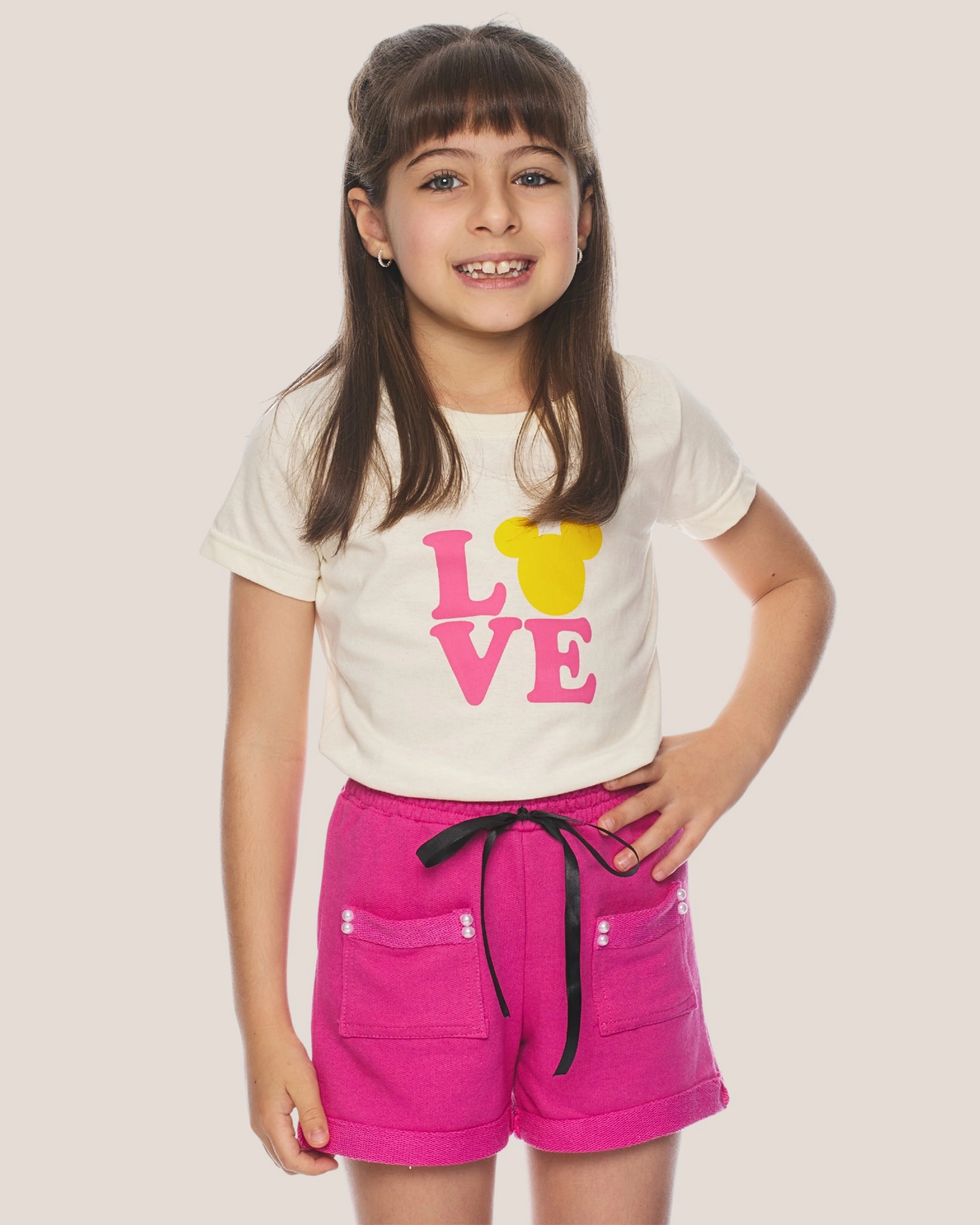 Esse conjunto infantil combina uma camiseta off-white com estampa "LOVE" da Minnie em tons vibrantes, trazendo a magia Disney de forma moderna e delicada.