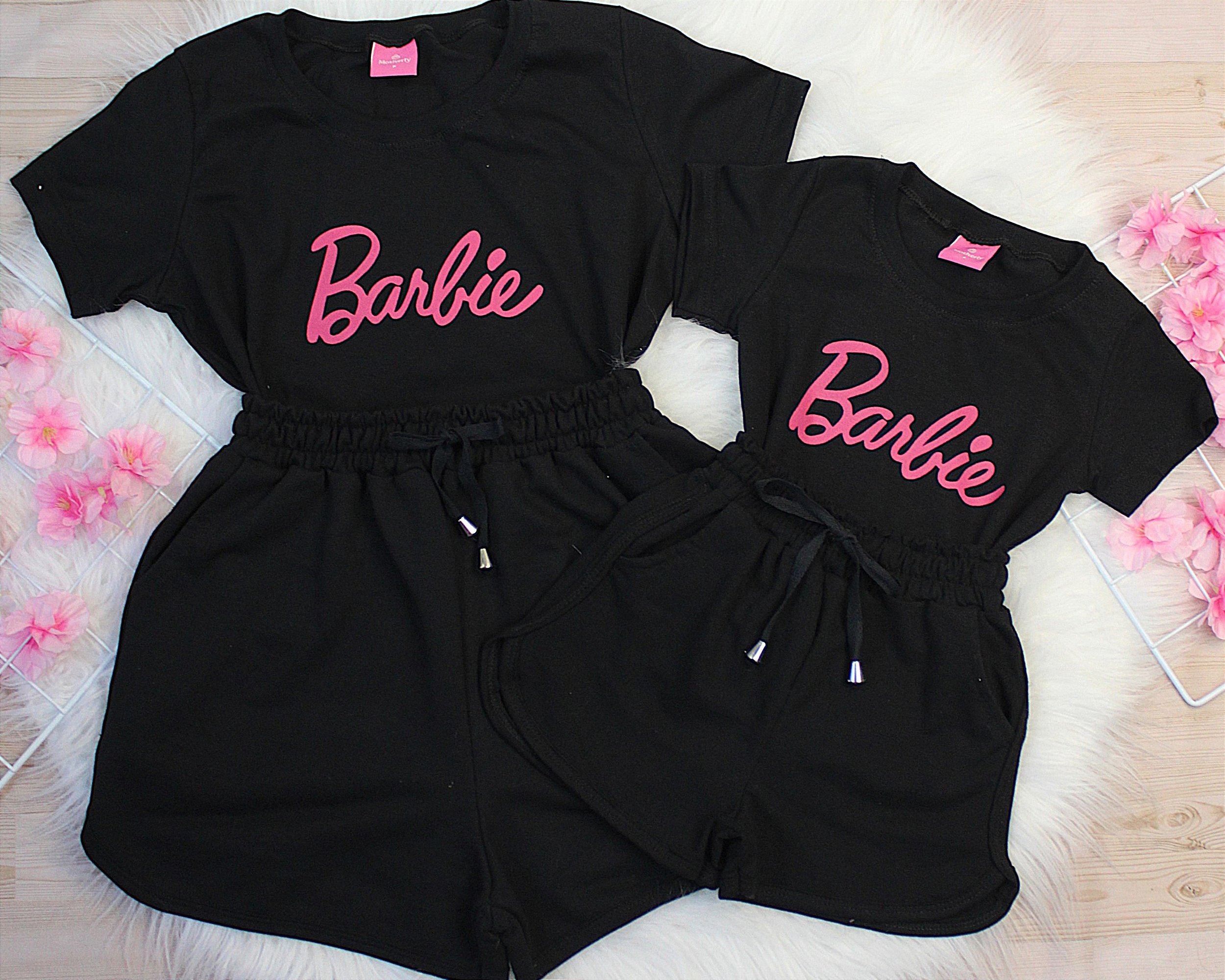 O conjunto é composto por camiseta e shorts pretos com estampa "Barbie" em rosa, unindo conforto e personalidade em um look que celebra o poder feminino e a conexão entre mãe e filha.