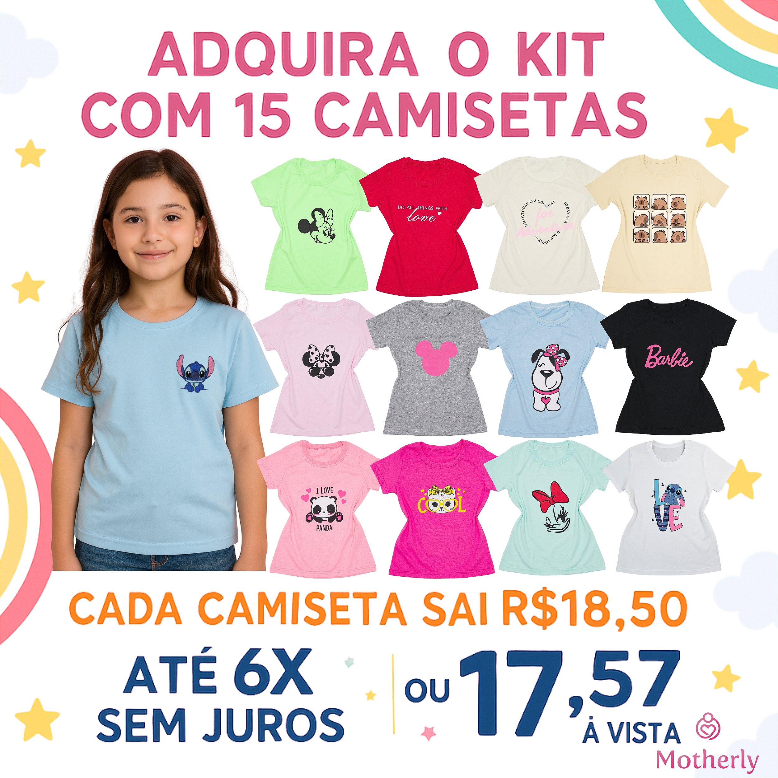 Garanta um guarda-roupa completo para as crianças com nosso Kit de 15 camisetas infantis sortidas, perfeitas para o dia a dia! Produzidas em malha fio 30.1, 100% algodão, são confortáveis, leves e ideais para acompanhar os pequenos em todas as ocasiões, unindo estilo e praticidade.