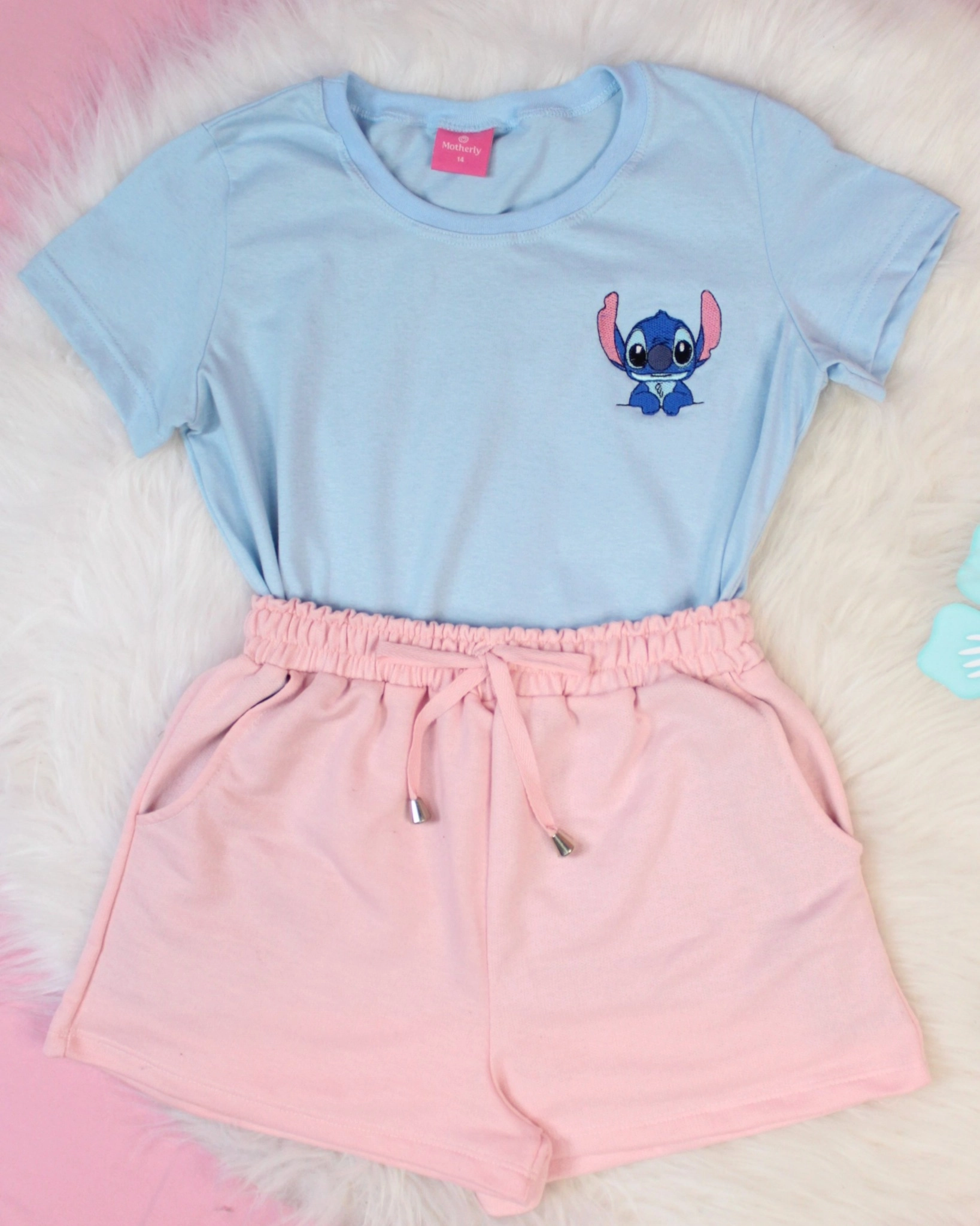 A camiseta azul bebê traz a estampa do Stitch — símbolo de amizade, lealdade e diversão — em um visual delicado que combina com a energia e o carinho das pequenas.