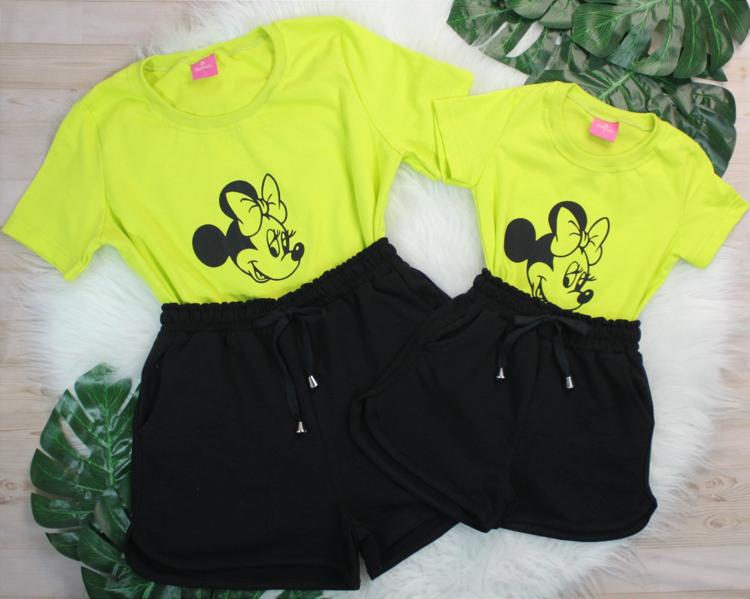 Com esse conjunto Tal Mãe Tal Filha, estilo e diversão andam lado a lado! A camiseta neon vibrante com estampa da Minnie em silk preto é perfeita para looks modernos e despojados, enquanto o shorts preto em moletinho leve garante conforto e liberdade para curtir o dia juntas.
